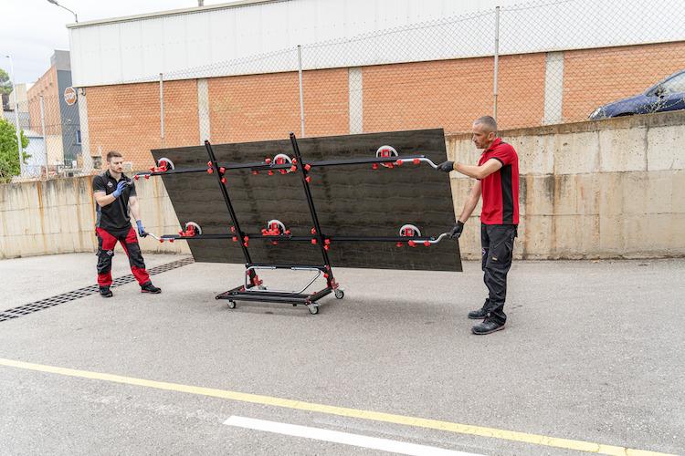 Doté d'une structure robuste et de ventouses à pompe, ce transporteur est spécialement adapté pour manipuler des charges lourdes (jusqu’à 170kg et 160x360cm), garantissant ainsi un transport sécurisé des carreaux sans risque de les casser.