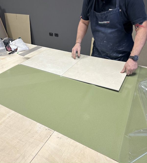 La plupart des grès céram du marché européen sont soumis à un pressage avant la cuisson. Les carreaux sont pressés à 9000 tonnes, alors que pour le carrelage sans colle, les carreaux sont pressés à 27000 tonnes, ce qui les rend beaucoup plus denses et donc plus résistants que tout autre carrelage. Aussi, ils sont revêtus à l’arrière d’une fibre de verre pour les rendre encore plus solides.